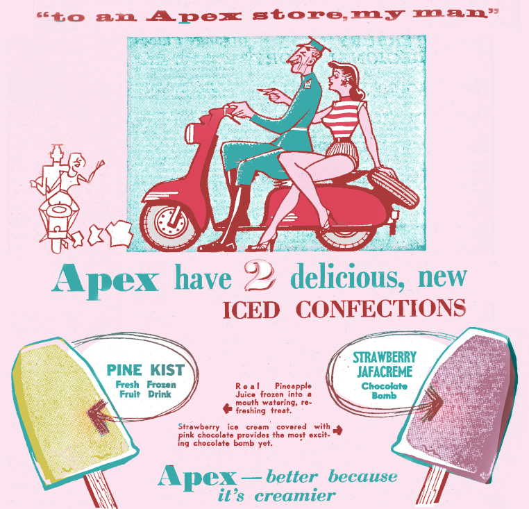 Apex Fruti Bar advertisement, May 1957