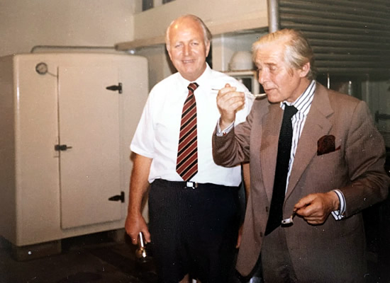 John Caulton (left) in his factory with fellow 132 Squadron pilot,