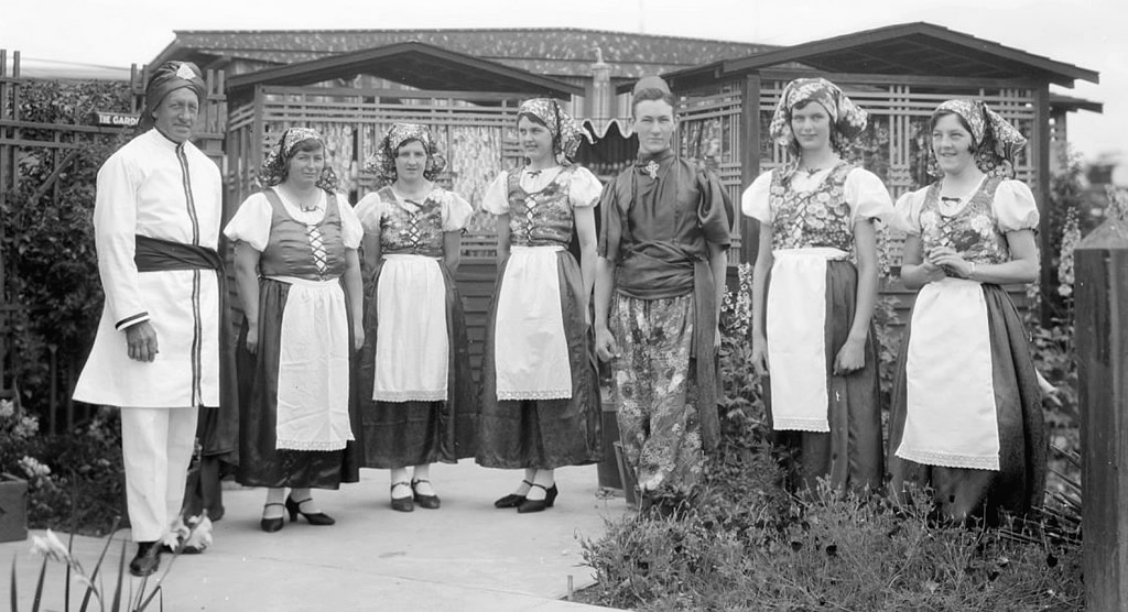 Frederick & Catherine with staff in fancy dress, 1930s.